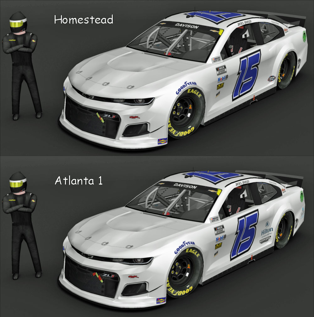 This time, a couple of simple schemes. 2021 #15 James Davison Camaros from Homestead and Allanta1. MENCS 2019 mod & template - Splash n' Go with Lefty updates to templates...... Sponsor logos from various internet sites and me...... Renders - The Mod Squad......