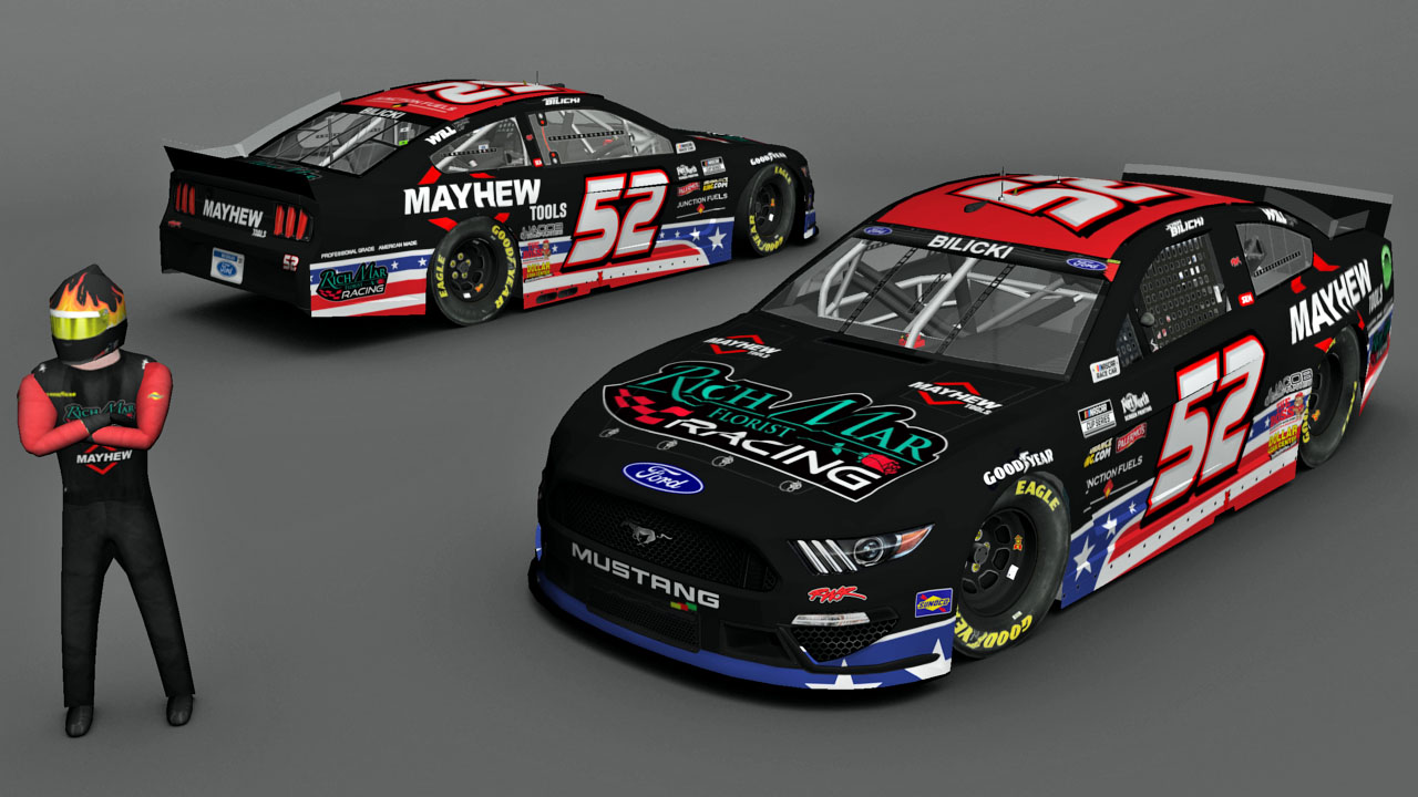 2021 #52 Josh Bilicki Mustang from New Hampshire. MENCS 2019 mod & template - Splash n' Go with Lefty template update...... #'s - me...... B-pillar decals - Rick's 2021 B-Pillars...... Sponsor logos from various internet sites/me...... Pit crew - SteveZ ( modified )...... NRatings for driver rating...... Render - The Mod Squad......