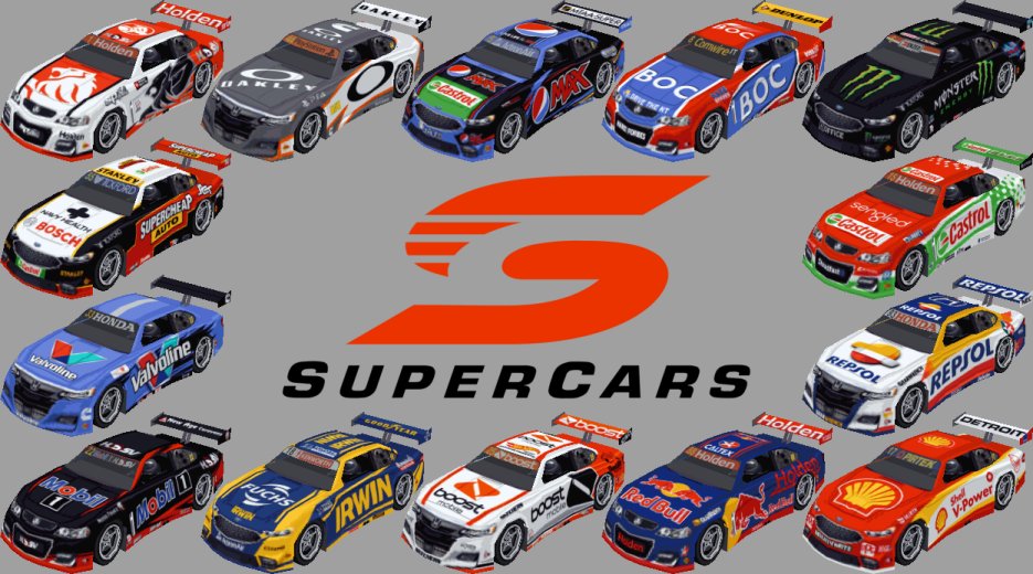 Fictional Australian Supercars carset painted for TPTCC body. Most cars were inspired by actual cars from Australian Supercars. Templates by Powersteamracing - Logos from various websites found using Google