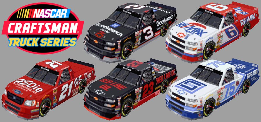 Here are six trucks to race with the original N3/CTSEP 1999 truck set. Trucks included are #3 (Mike Skinner), #6 (Rick Carelli), #21 (Tim Steele), #23 (Phil Bonifield) and #75 (Lonnie Rush Jr and Marty Houston). Credits in the Readme.txt file. Screen Shot: