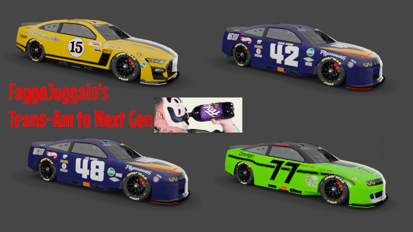 4 Pack of 1970's Trans Am racers- 77 Sam Posey, 15 Parnelli Jones, 42 Swede Savage, 48 Dan Gurney. BillA1947 from Stunod made the Dodge Template, and I added bits to make a Plymouth Cuda one as well. FCRD Philly_T Next gen ford temp. All numbers are made by me, and the "Base Schemes" were made by me also. James Hodge Orthographic Render Scene, modified by me. The vintage decals came from all over, mostly from decal/sticker packs on ebay and cut out - anything else would be from google images. The dodge/cuda imports on the dodge body in game (generic), ford to, well, ford. (These go in the FCRD Next Gen 2022 mod)