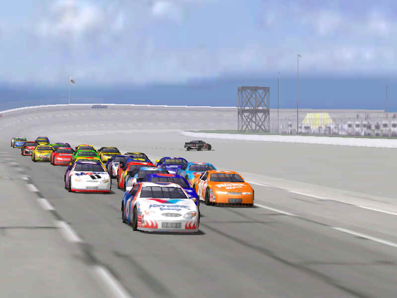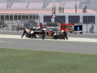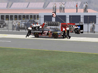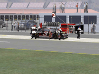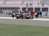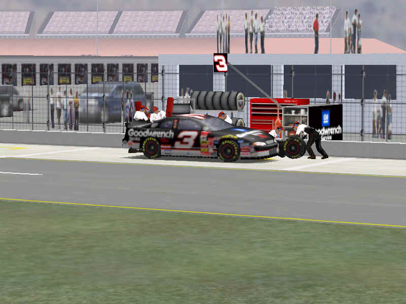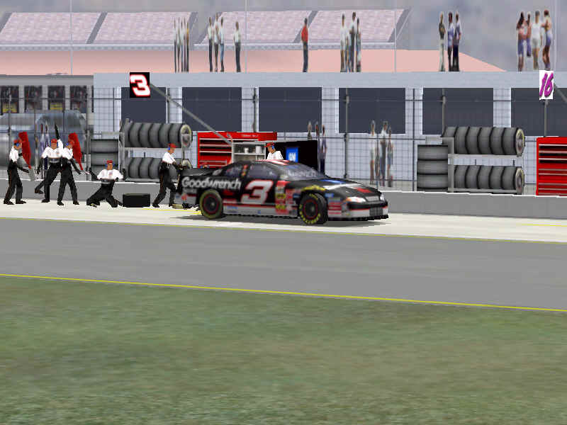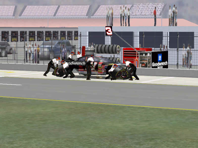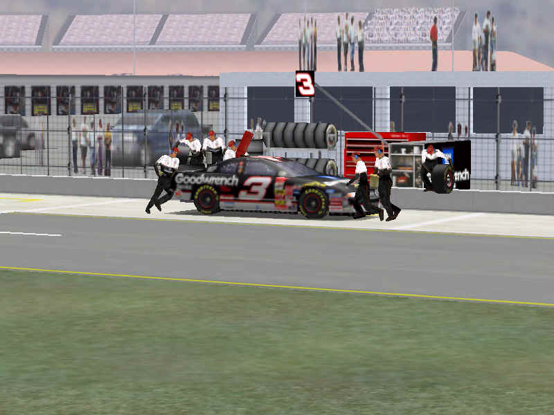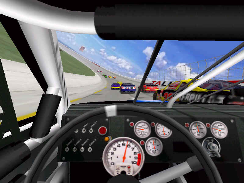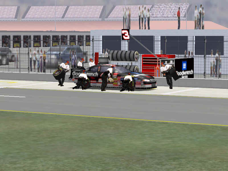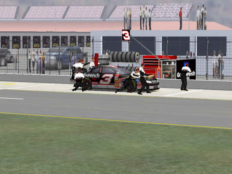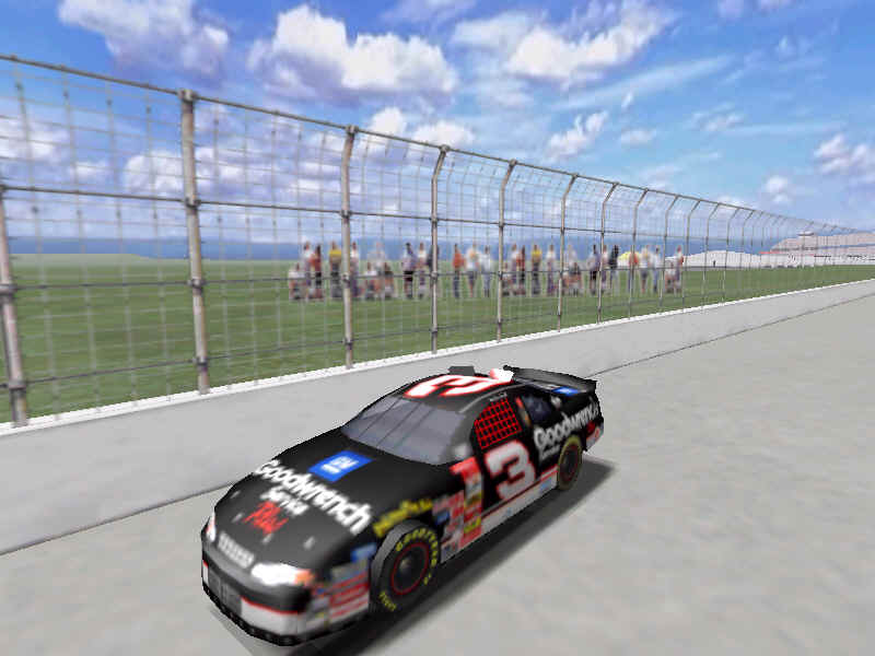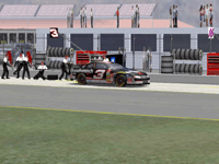 The first screen shot is a shot of me as I lose it off of two at Talladega. M. Waltrip got into the side of me and caused me to do a typical takeoff pattern at the track. My car spun backwards towards the wall (this is the beginnings, however I didn't take screen shots of the rest, I will try to get some good ones for tomorrow). Once backwards my car caught a little air under it and began to lift from the bumper and skate around until takeoff. The actual air was not unlike that of Bill Elliot a few years ago when he broke his femer, except in this one I ended upside down. It was the most realistic crash I have ever seen at this track. There are many additions to Heat that we have all been waiting a long time for, and this list includes things beyond the obvious flipping cars. Most would like to see an animated pit crew that services your car in record time, this is included. I have put a sequence of shots below that show the pit action. You see the crew members from every angle including the in car. Guys are running around and you can head the jack and air wrenches. The one thing I noticed missing was the winshield washer. Another added bit of realism is that of roof flaps. When you spin at an increased speed you can see your roof flaps deploy to keep you on the ground. I also included a shot of this as I spun backwards through the pre-pit entrance at Tally. The final two shot is just from some very close racing at Dega. While the physics model/AI reactions are not completely finished, this seems a little more realistic than previous sims. You can gently lay your car along side of another without losing control, just to move them out of the way, but if you hit them a little to hard, chances are you will meet in the wall. The shot I included is of me making a little room down low.
